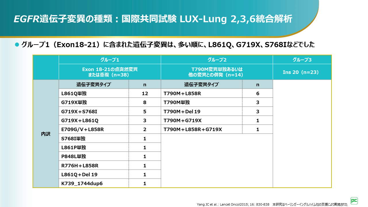 3グループのEGFR遺伝子変異タイプの内訳はご覧の通りです。グループ1には L861Q単独12例、G719X単独8例などが含まれました。(図4)