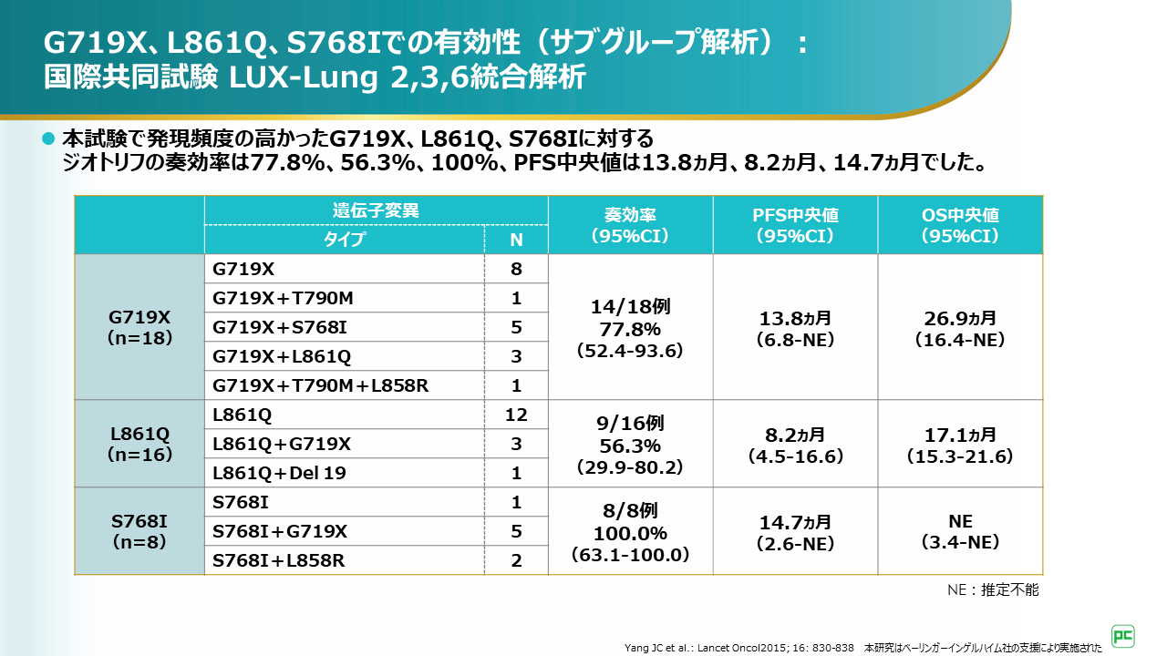 本統合解析では、 LUX-Lung 2、3、6試験でランダム化または治療を受けた838例のうちジオトリフが投与され、かつUncommon mutationを有する75例を3グループに層別化し、同じくUncommon mutationを有する化学療法群25例とともに解析を行いました。