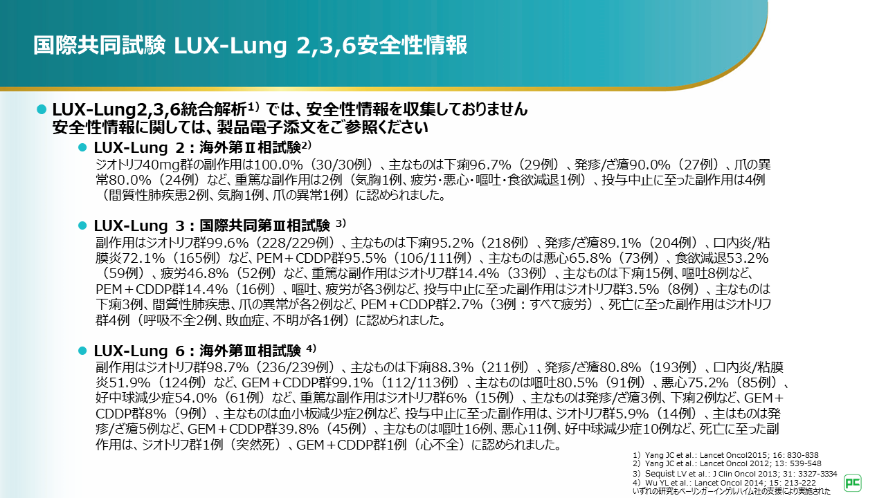 LUX-Lung2,3,6統合解析では、安全性情報を収集しておりません。安全性情報に関しては、製品電子添文をご参照ください。