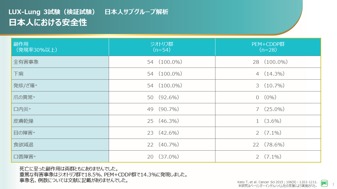 ジオトリフは、EGFR-TKIを含む化学療法未治療のEGFR遺伝子変異陽性NSCLC患者345例を対象に、国際共同第Ⅲ相臨床試験LUX-Lung 3試験が行われました。本試験の対象症例345例には、日本人83例が含まれていました。