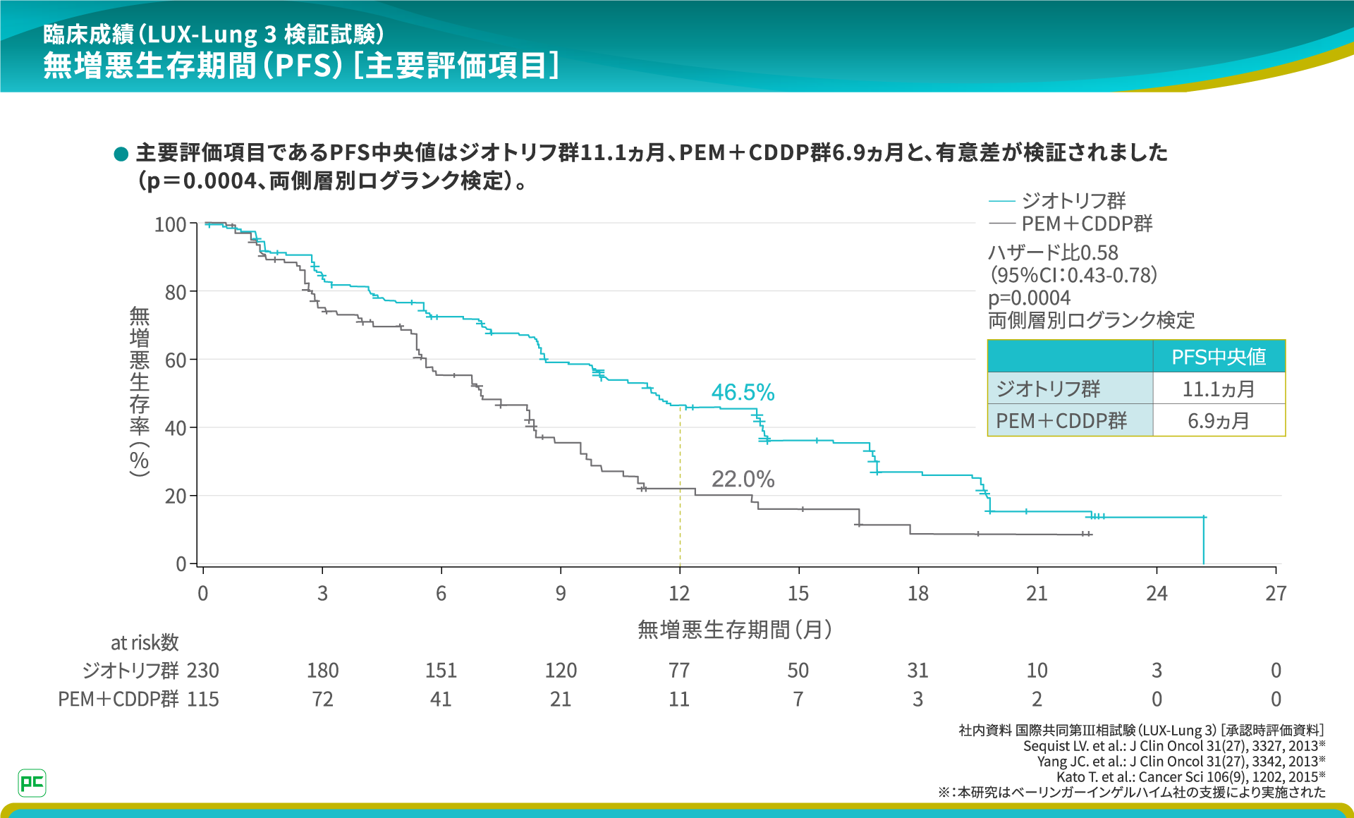主要評価項目であるPFS中央値は、ジオトリフ群11.1ヵ月、PEM+CDDP群6.9ヵ月であり、ジオトリフ投与によるPFSの有意な延長が検証されました。
