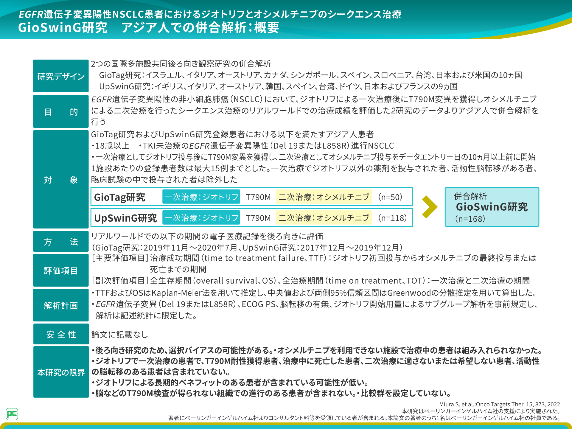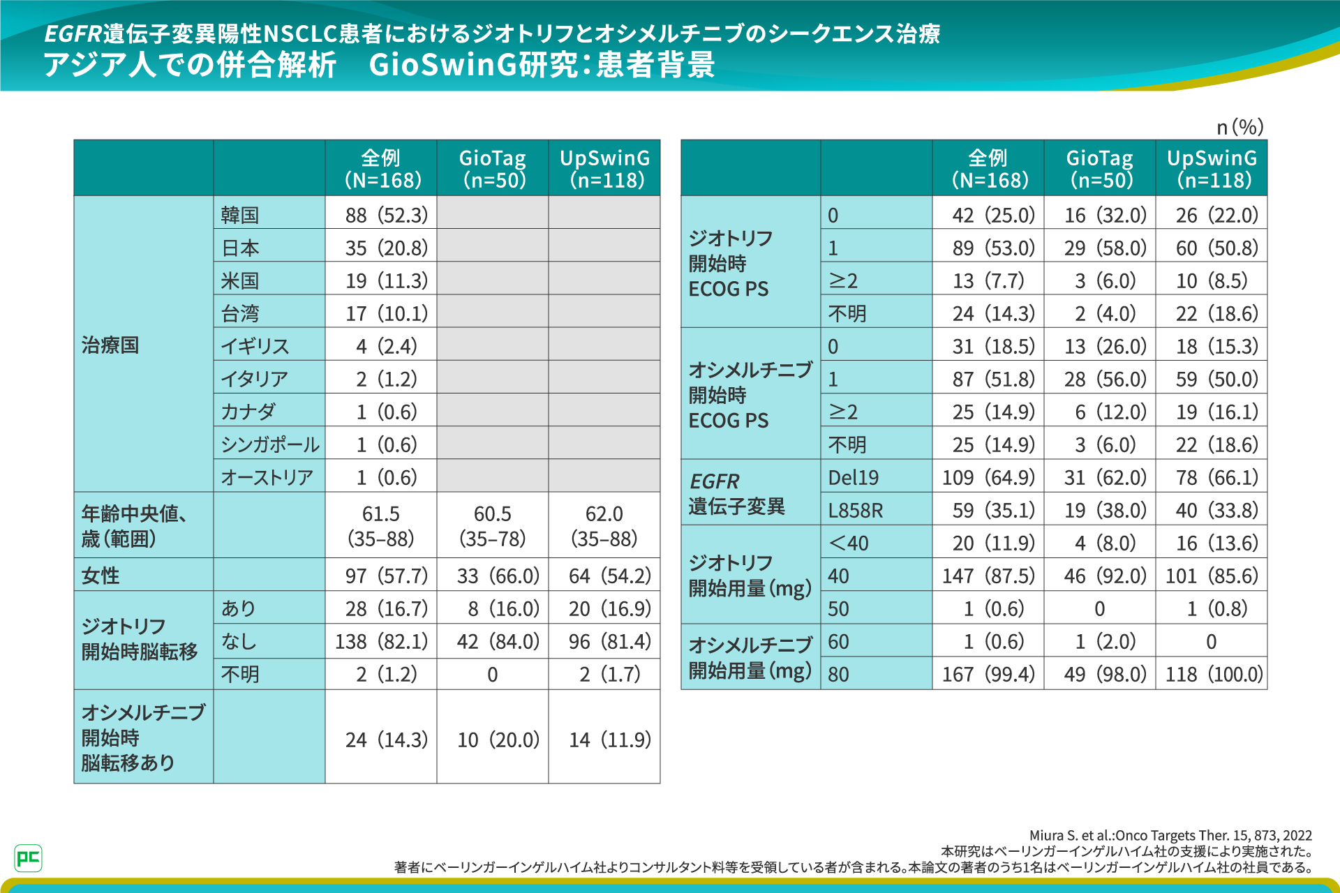EGFR遺伝子変異陽性NSCLC患者においてジオトリフによる一次治療後にT790M変異を獲得し、オシメルチニブによる二次治療を行ったアジア人168名のデータが報告されています。