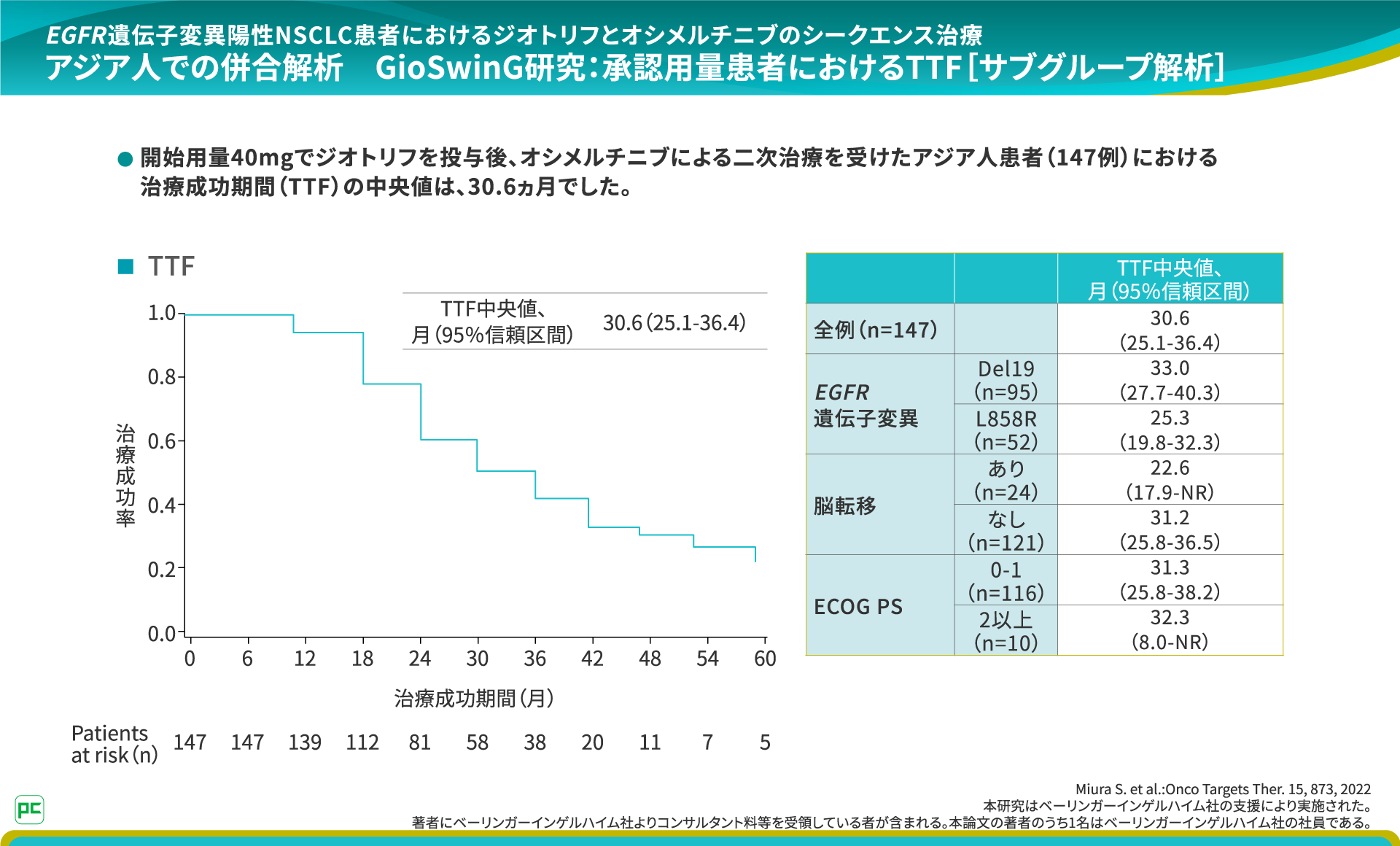 開始用量40mgでジオトリフを投与後、オシメルチニブによる二次治療を受けたアジア人患者(147例)における治療成功期間(TTF)の中央値は、30.6ヵ月でした。
