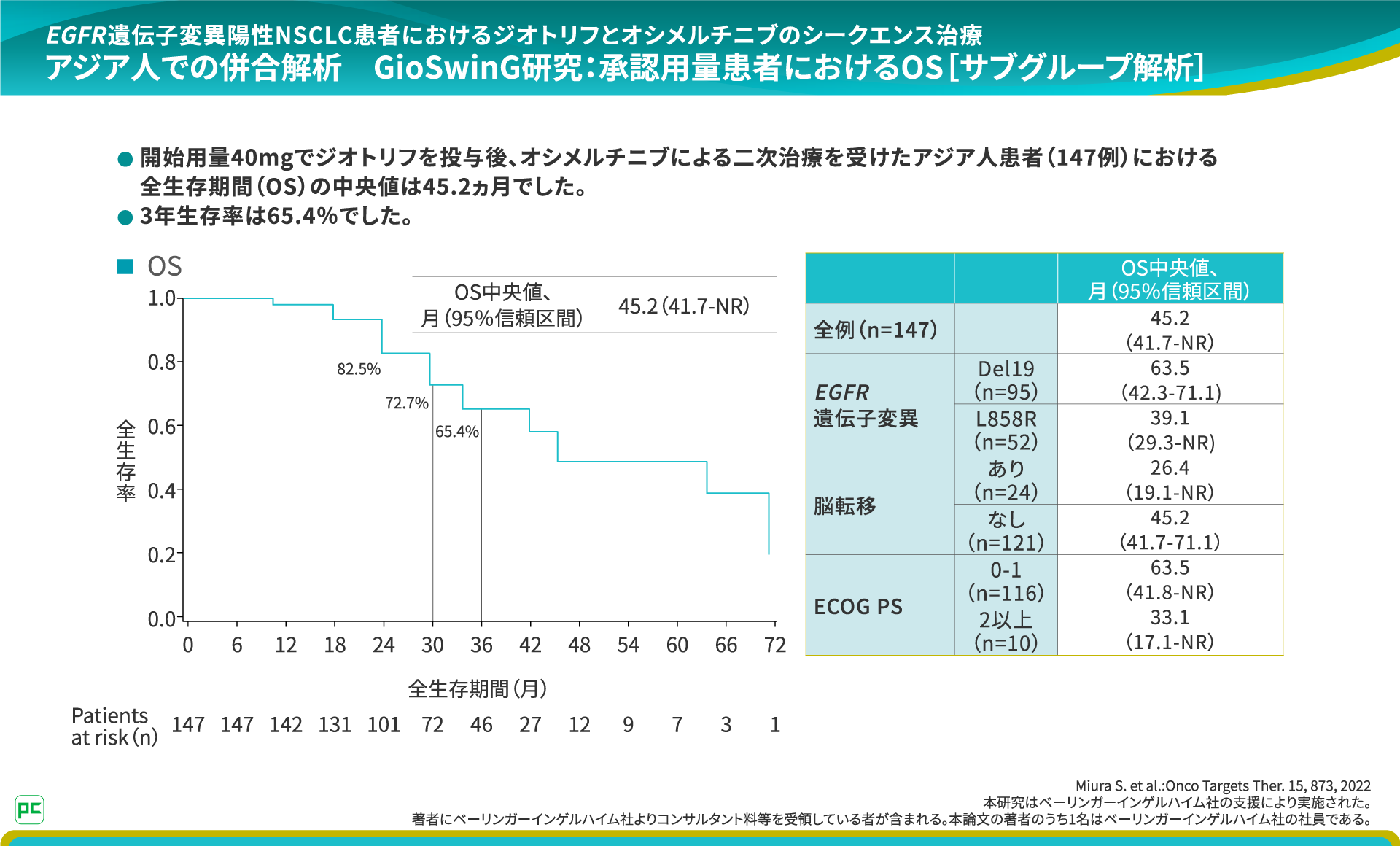 また、全生存期間(OS)の中央値は45.2ヵ月であり、Del19では63.5ヵ月、L858Rでは39.1ヵ月と良好な結果を示しています。