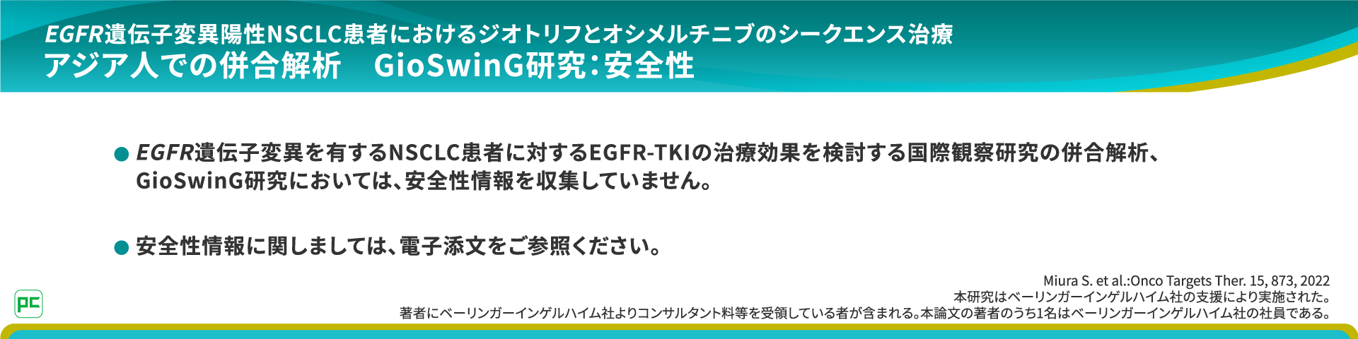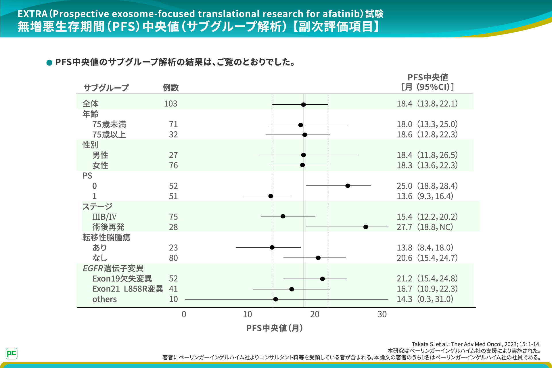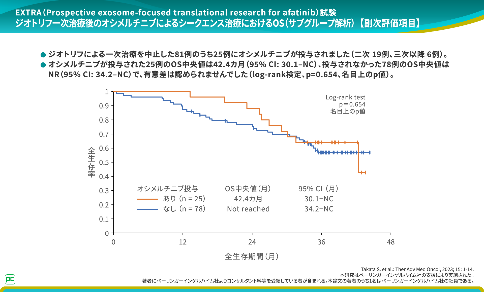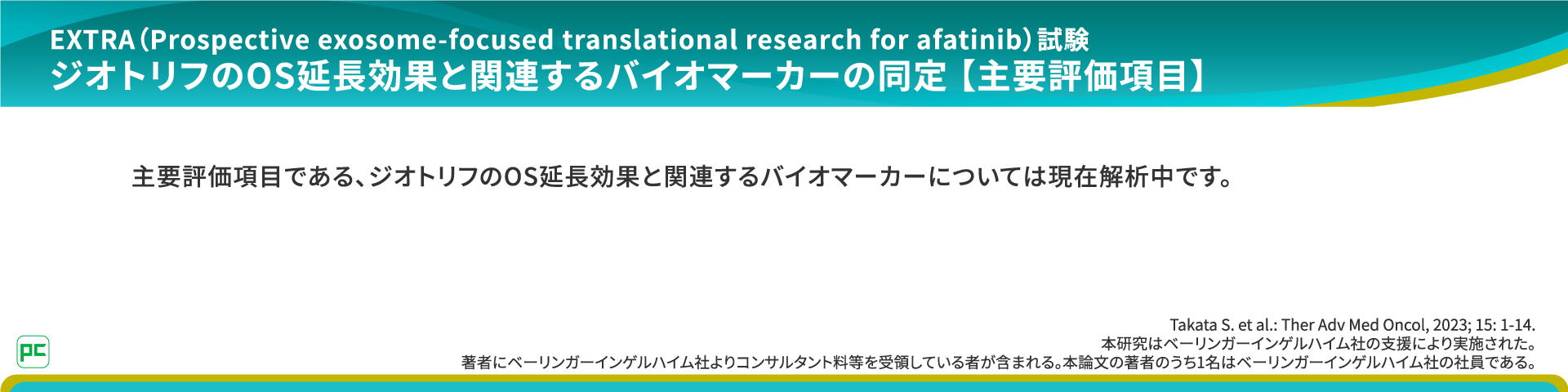 著者にベーリンガーインゲルハイム社よりコンサルタント料等を受領している者が含まれる。本論文の著者のうち1名はベーリンガーインゲルハイム社の社員である。 - Takata S. et al.: Ther Adv Med Oncol, 2023; 15: 1-14.