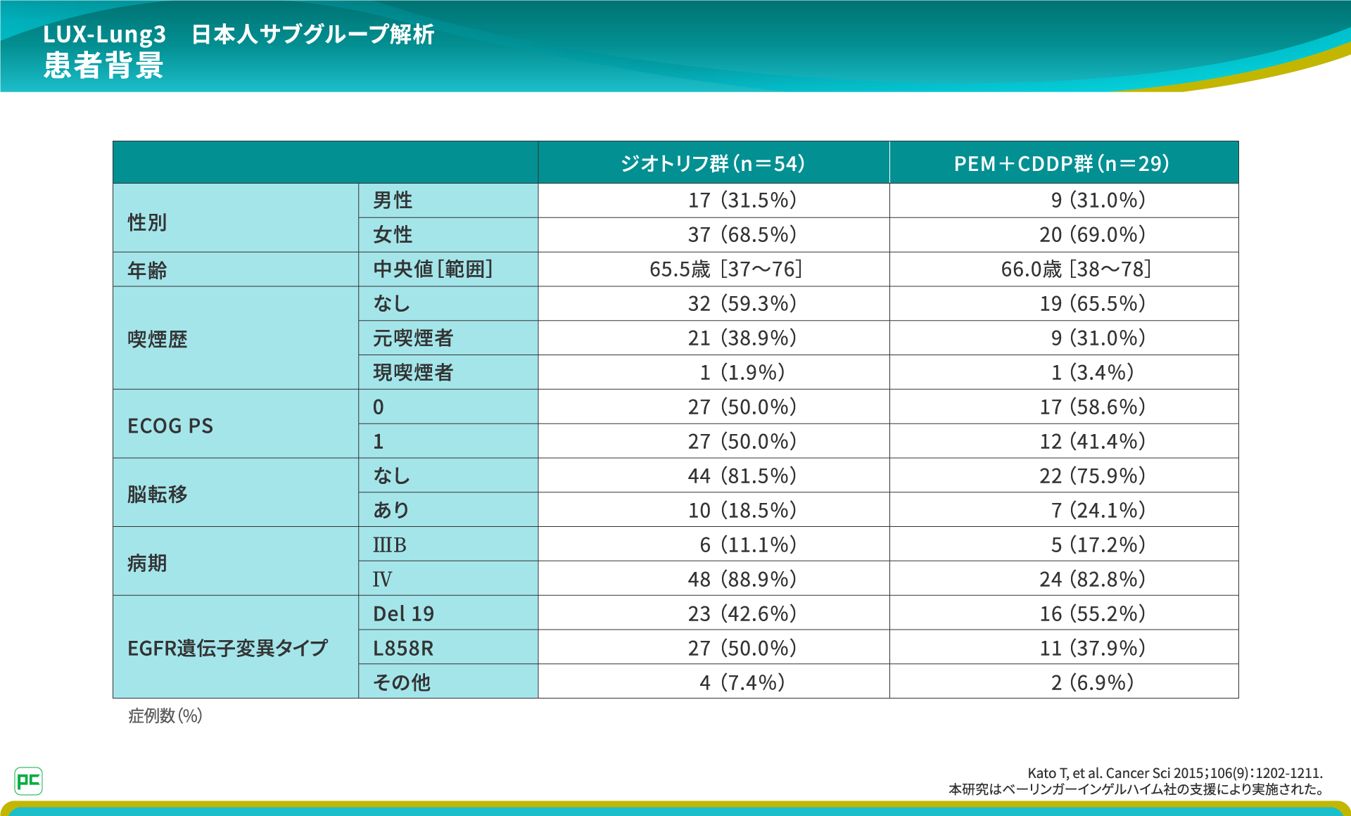 LUX-Lung3試験には、日本人が83例含まれており、日本人集団のサブグループ解析が実施されました。各群の患者背景はこちらのとおりでした。