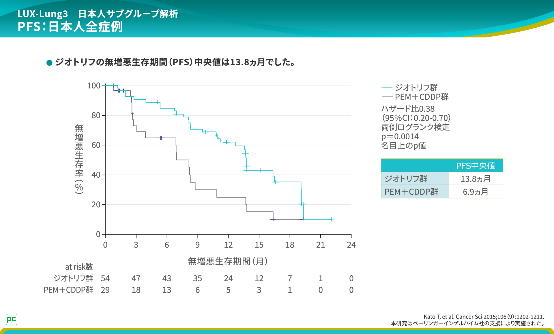 本解析の結果、日本人集団全体のPFS中央値はジオトリフ群13.8ヵ月、PEM+CDDP群6.9ヵ月で、ジオトリフ投与による62%の再発リスク低下が認められました。