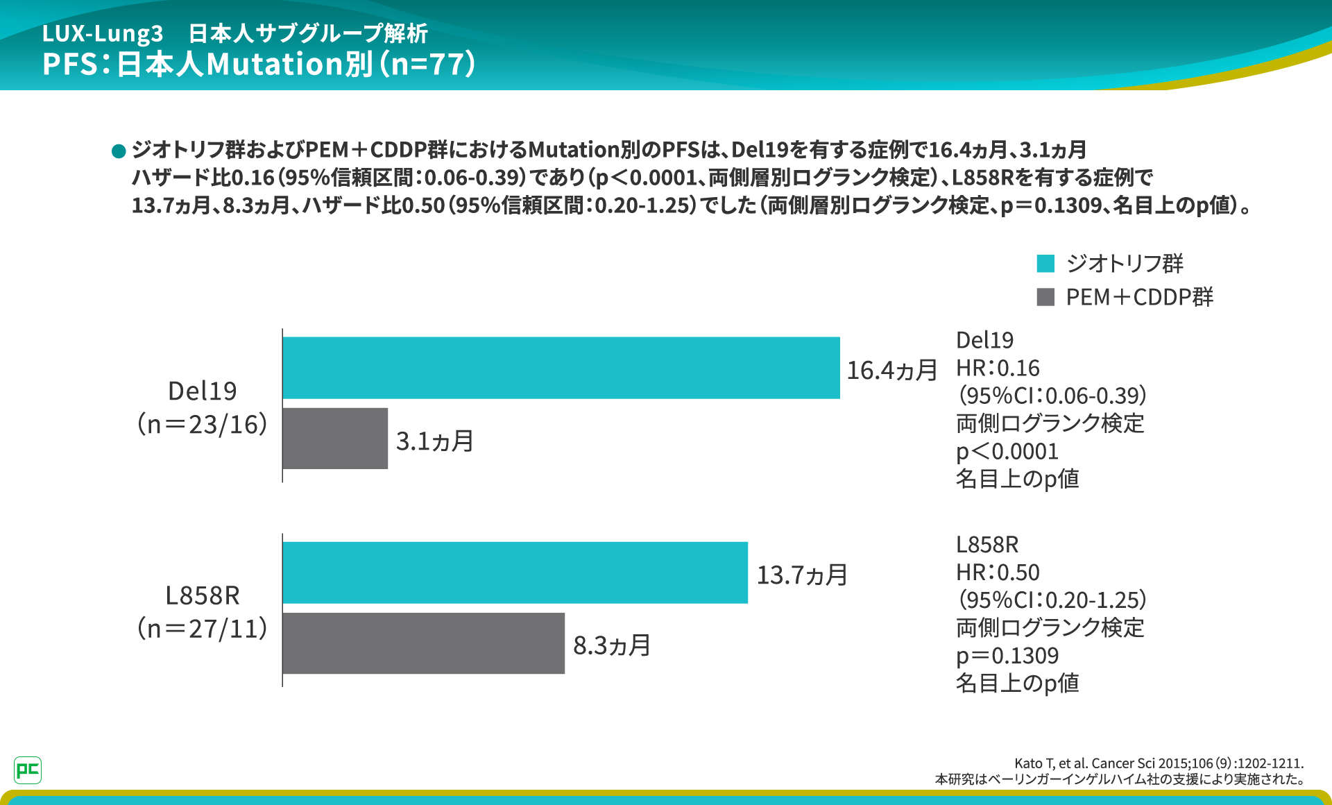 変異別の結果をみると、L858Rを有する症例におけるPFS中央値は、ジオトリフ群13.7ヵ月、PEM+CDDP群8.3ヵ月でした。