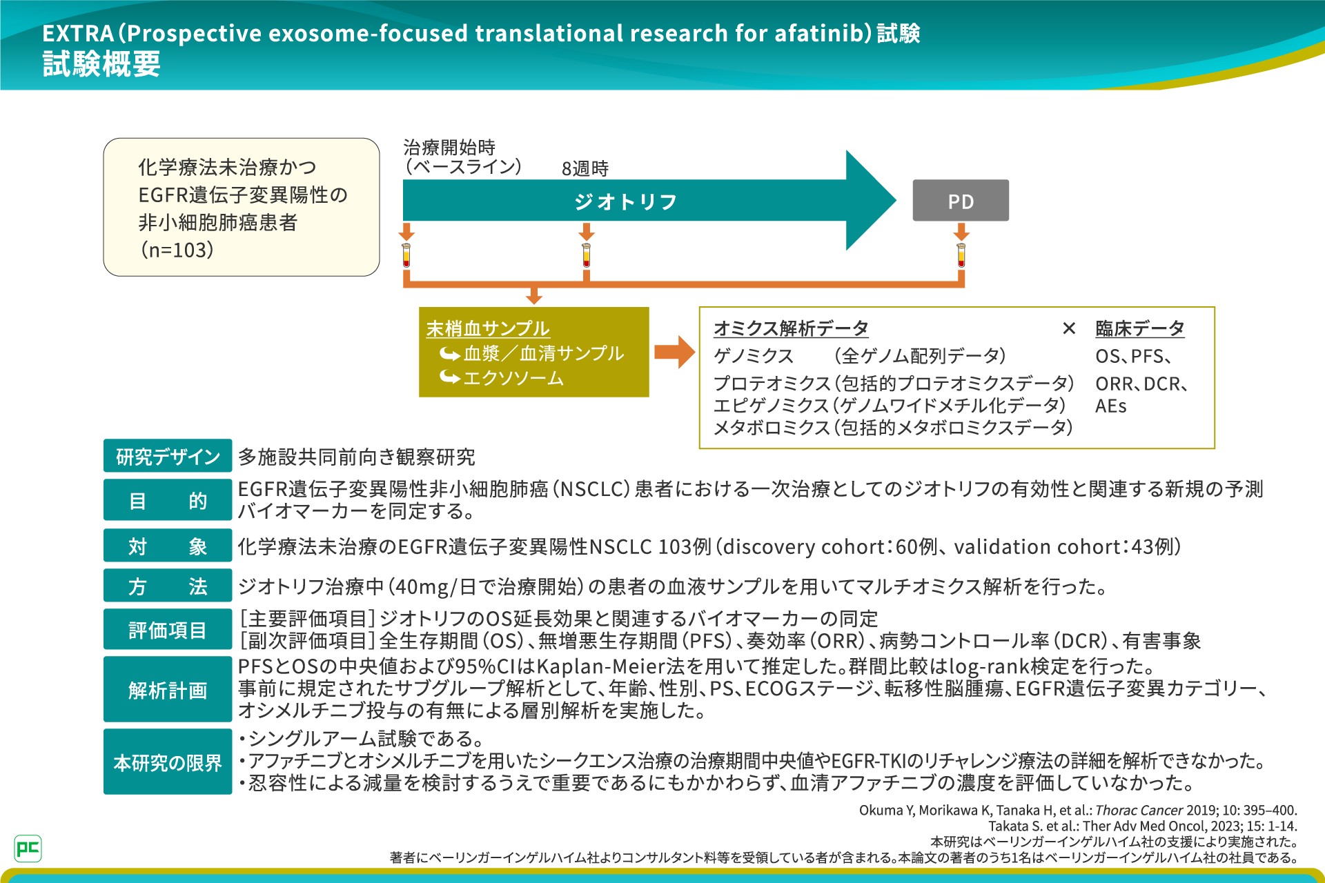 EXTRA試験は、EGFR遺伝子変異陽性非小細胞肺癌における一次治療としてのジオトリフの有効性と関連する新規の予測バイオマーカーを同定することを目的にデザインされた、国内21施設による多施設共同前向き観察研究です。今回の報告は、試験結果のうち臨床パートのみの報告となっています。
