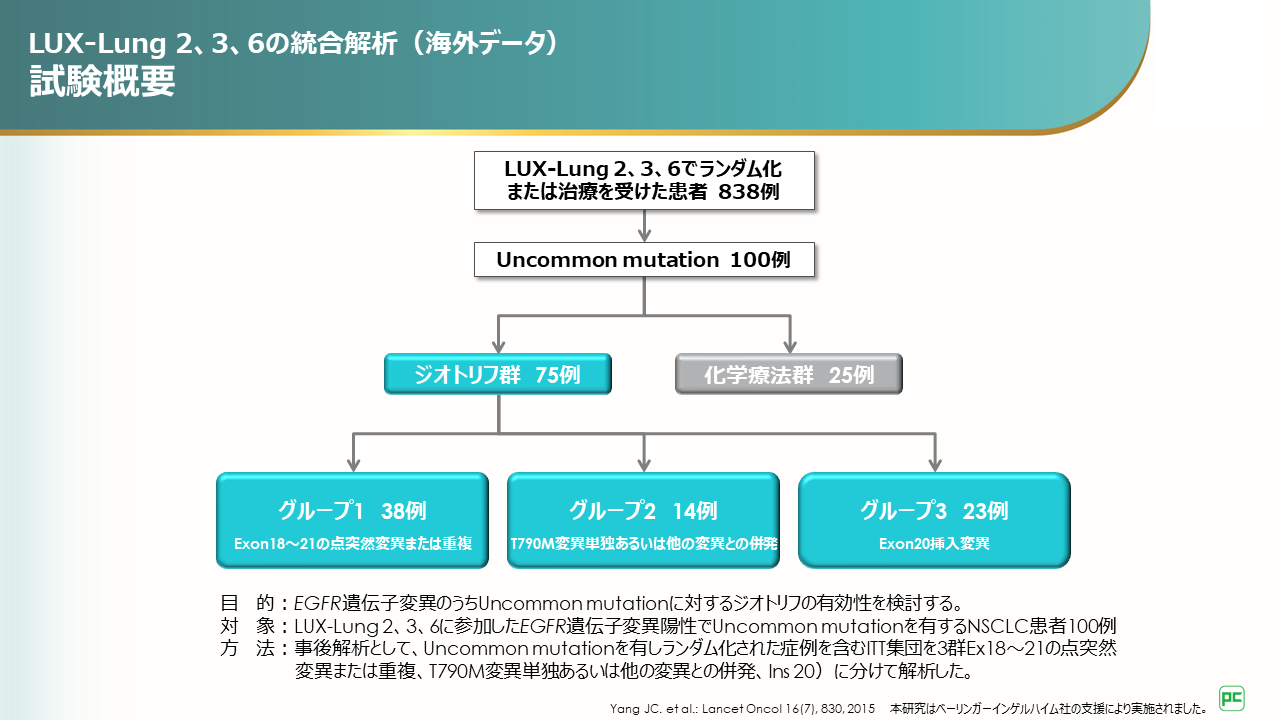 LUX-Lung 2,3,6試験に登録されたuncommon mutationを有するEGFR遺伝子変異陽性進行肺線癌患者100例を対象とし、EGFR遺伝子変異のタイプ別に3群に分類して解析を行っています。