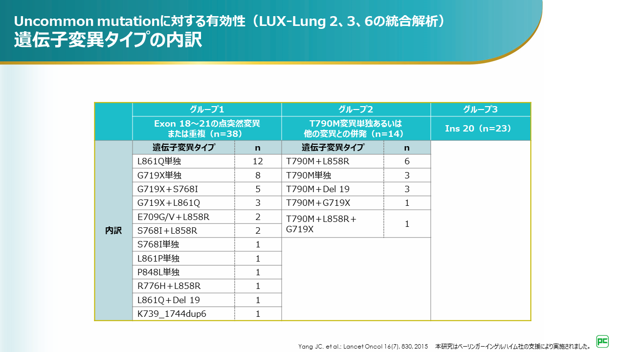 このuncommon mutationに対するアファチニブの有効性を検討した、LUX-Lung 2,3,6試験統合解析を紹介いたします。