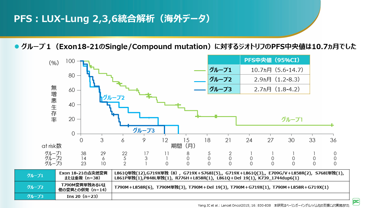 グループ1(Exon18-21のsingle/compound mutation)に対するアファチニブのPFS中央値は10.7ヵ月でした。