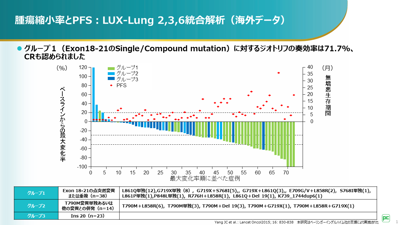 グループ1(Exon18-21のsingle/compound mutation)に対するアファチニブの奏効率は71.7%でした。