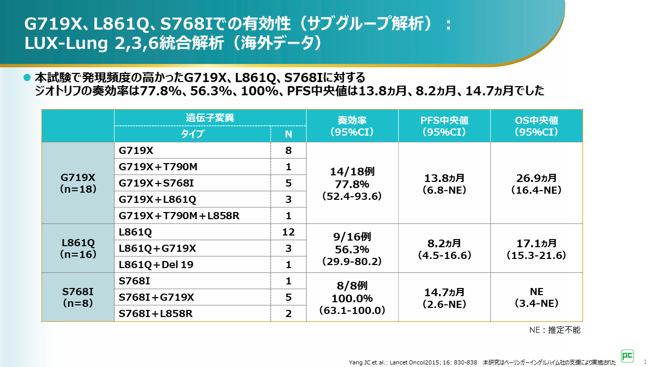 本統合解析で発現頻度の高かったG719X、L861Qに対するアファチニブの奏効率は77.8%、56.3%でした。