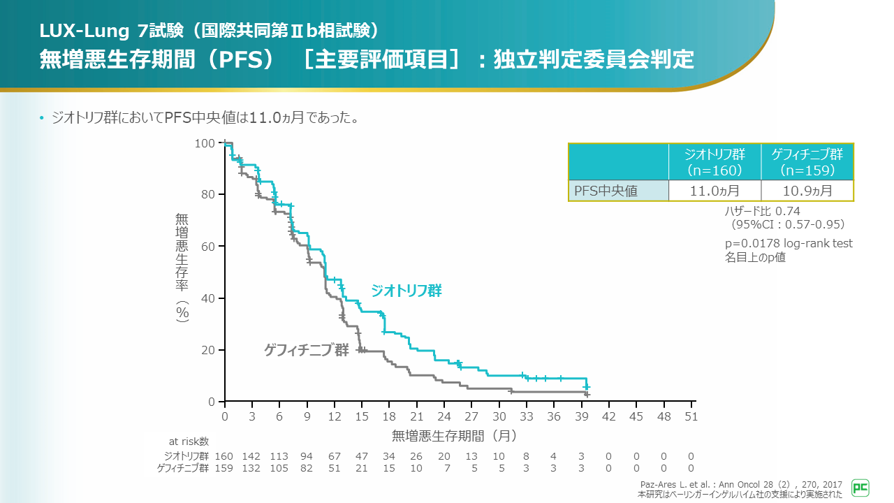 アファチニブ群においてPFS中央値は11.0ヵ月でした。