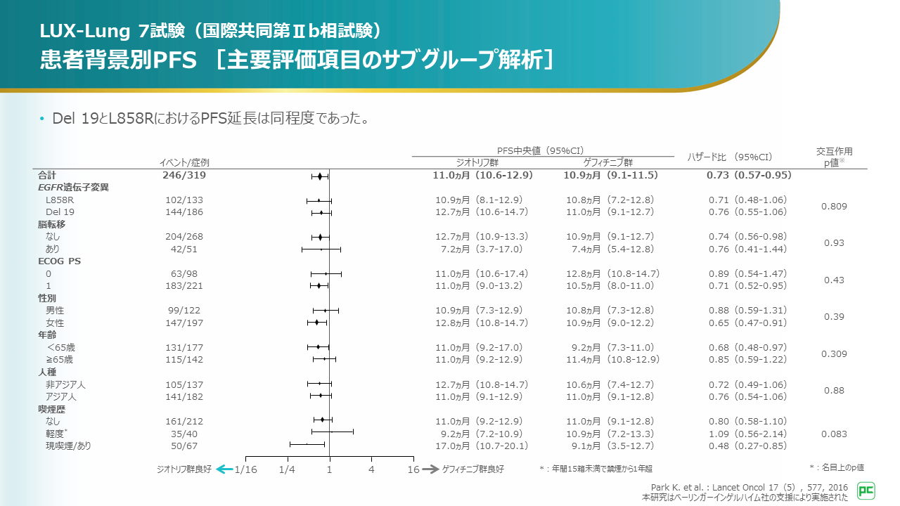 主要評価項目のサブグループ解析では、Del 19とL858RにおけるPFS延長は同程度でした。