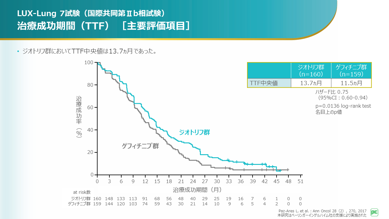アファチニブ群においてTTF中央値は13.7ヵ月でした。