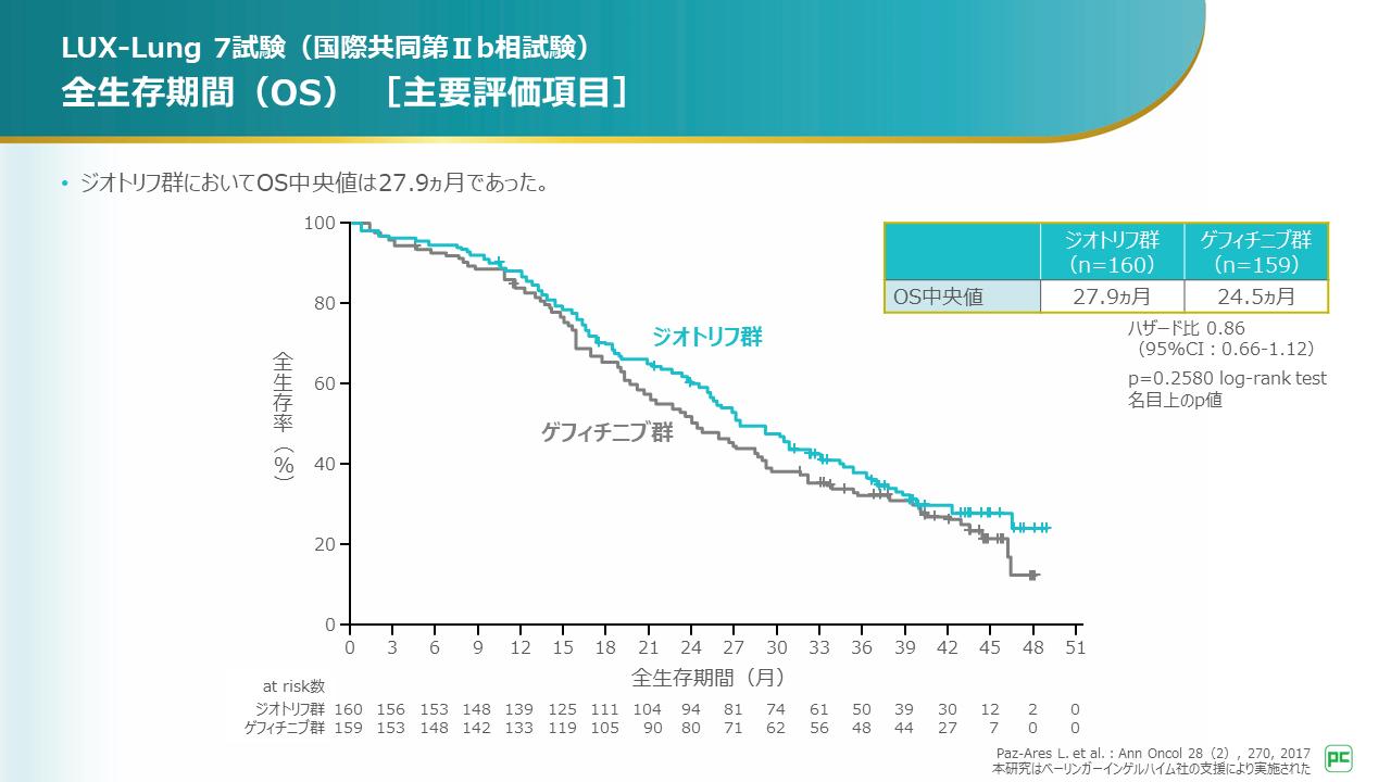 主要評価項目であるOS中央値は、アファチニブ群27.9ヵ月、ゲフィチニブ群24.5ヵ月でした(ハザード比0.86)。