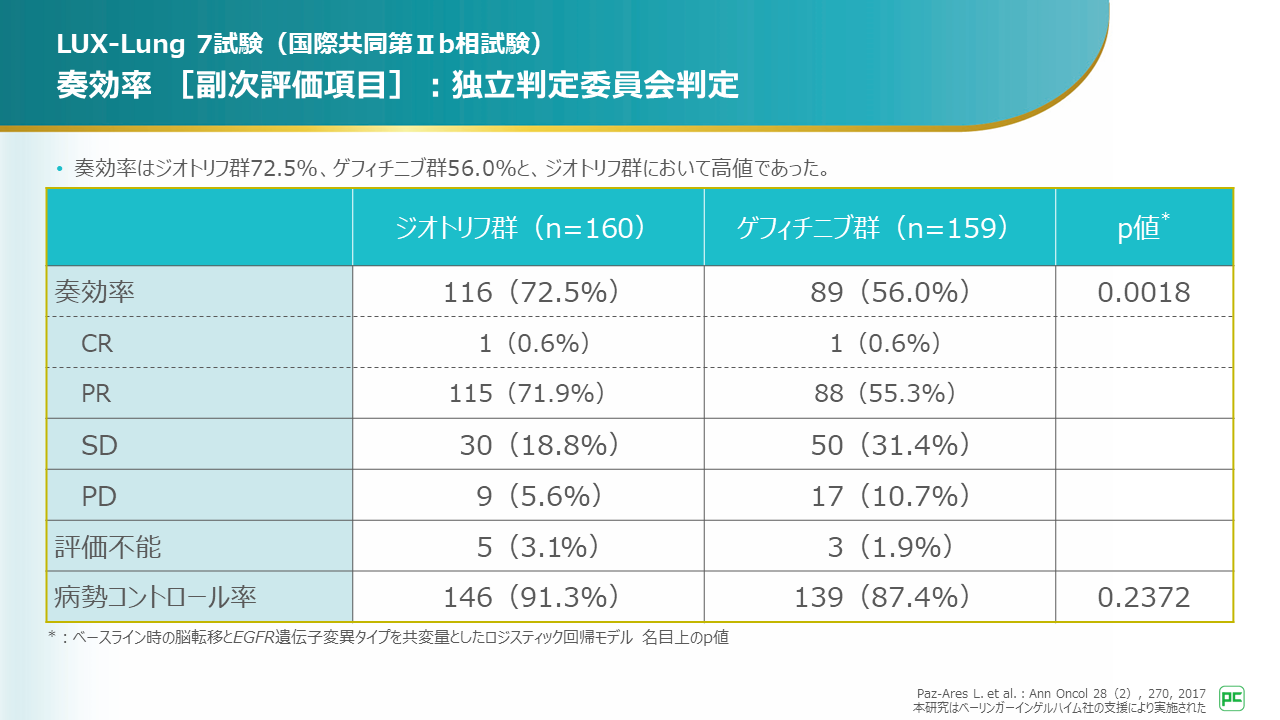 奏効率はアファチニブ群72.5%、ゲフィチニブ群56.0%と、アファチニブ群において高値でした。