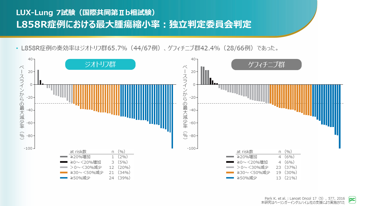 L858R症例の奏効率はアファチニブ群65.7%(44/67例)、ゲフィチニブ群42.4%(28/66例)でした。