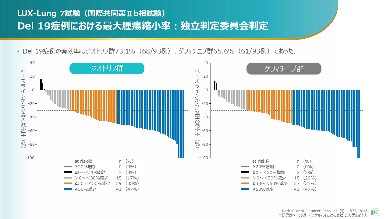 Del 19症例の奏効率はアファチニブ群73.1%(68/93例)、ゲフィチニブ群65.6%(61/93例)でした。