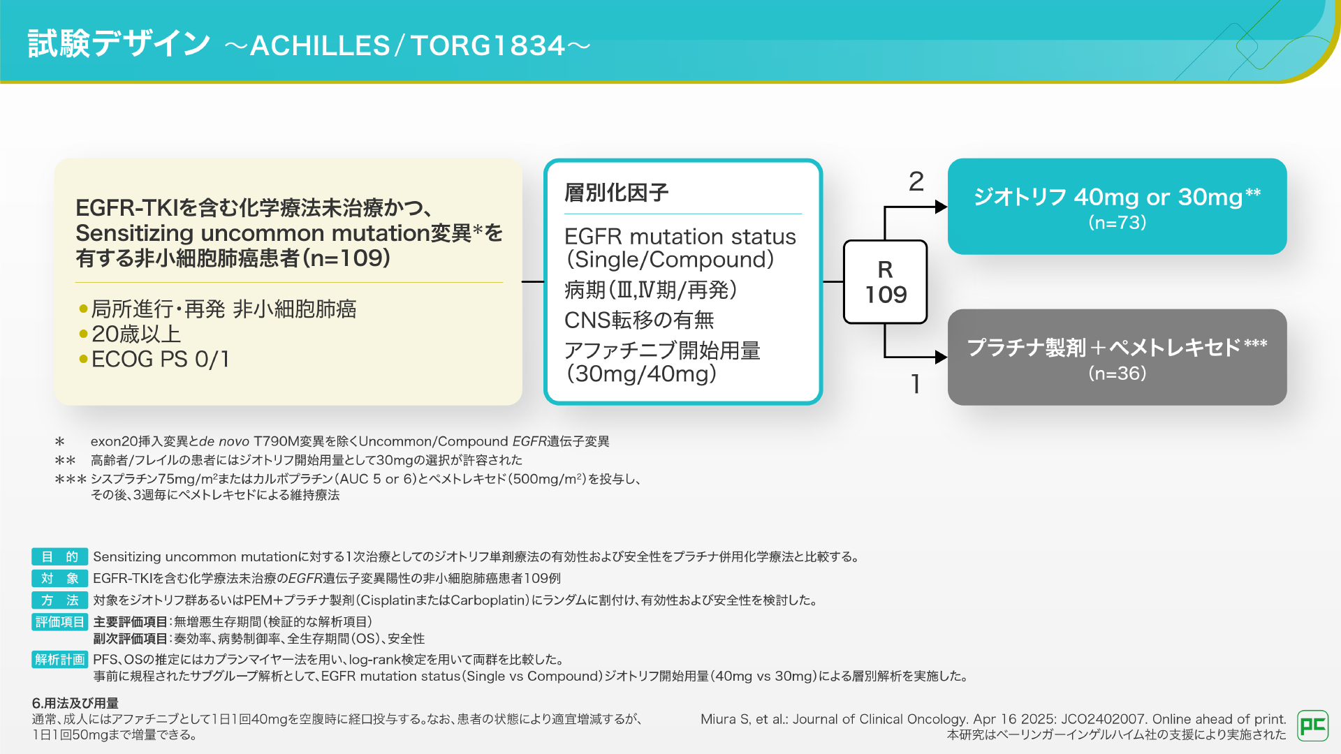 ACHILLES試験は、Uncommon mutationsを持つEGFR遺伝子変異陽性NSCLCにおいて、一次治療としてのジオトリフ単剤療法と化学療法を比較したランダム化比較試験です。