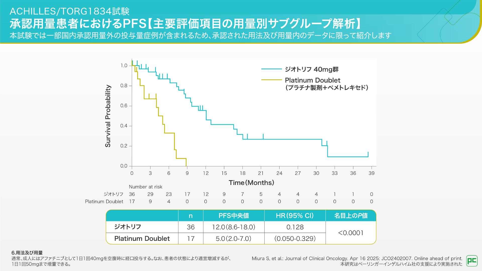 本試験では、主要評価項目として無増悪生存期間(PFS)を評価しました。その結果、PFS中央値は承認用量であるジオトリフ40mg群で12.0ヵ月、PtD+PEM群で5.0ヵ月であり、ハザード比0.128でジオトリフ40mg群における有意な延長が示されました。
