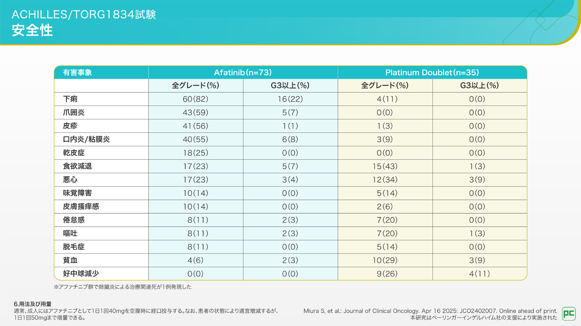 全有害事象の発現割合はジオトリフ群で71/73例(97%)、PtD+PEM群で32/35例(94%)でした。ジオトリフ群における主な有害事象は、下痢60例(82%)、爪囲炎43例(59%)、皮疹41例(56%)、口内炎/粘膜炎40例(55%)などでした。