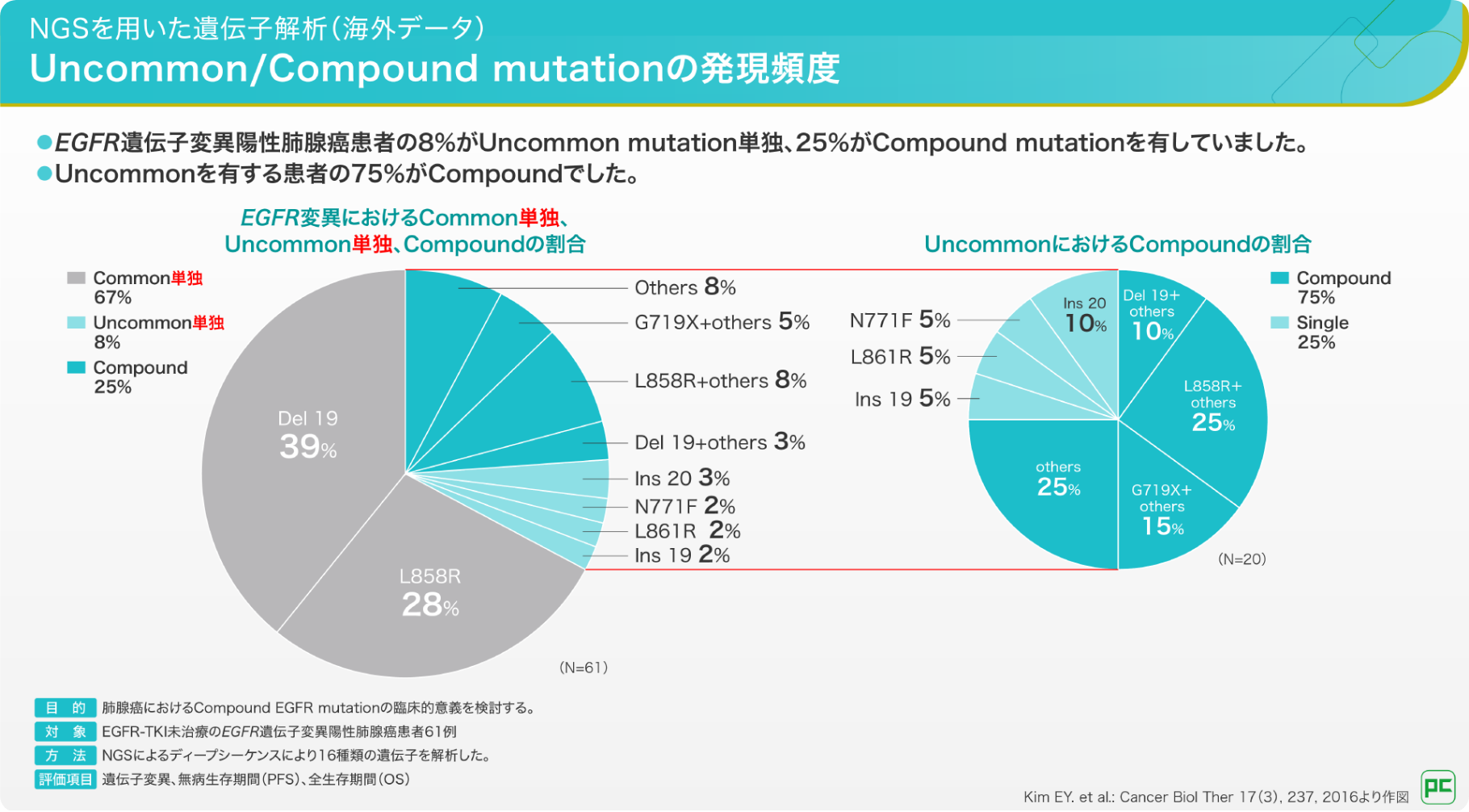 遺伝子変異には単一の遺伝子変異を有する場合(Single mutation)と、複数の遺伝子変異を有する場合(Compound mutation)があり、Compound mutationはCommon mutation を含む場合でもUncommon mutationに分類されます。Compound mutationはUncommon mutationの75%を占めるとされ6)、Single mutationと比べて細胞増殖能が高いことを示唆する報告もあります2)。