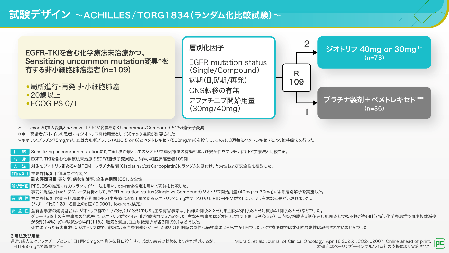 実臨床との乖離はあると感じています。実際に、ランダム化比較試験であるACHILLES試験7)の実施にあたっては、ジオトリフに感受性がある全てのUncommonおよびCompound mutationを対象としましたが、目標症例数に到達するのに予想以上の時間がかかりました。
