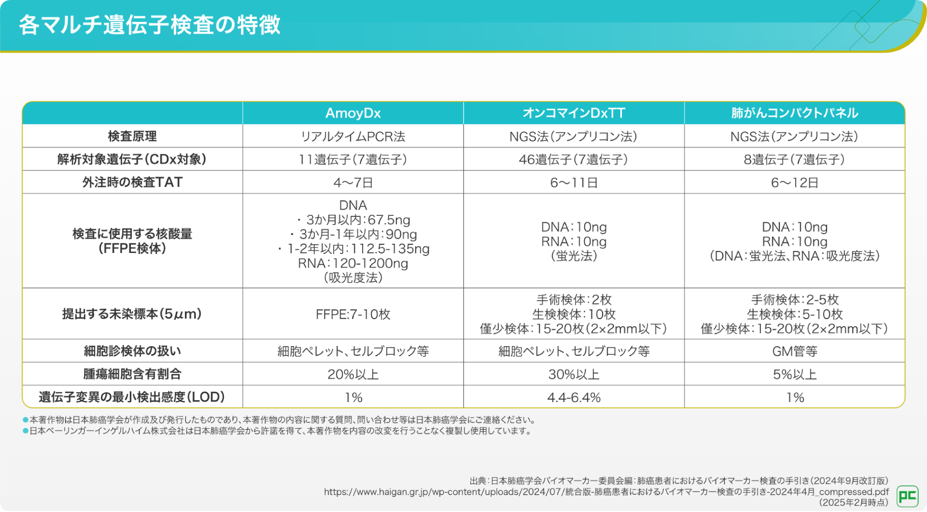 著者にベーリンガーインゲルハイム社よりコンサルタント料等を受領している者が含まれる。 - 日本肺癌学会バイオマーカー委員会編:肺癌患者におけるバイオマーカー検査の手引き(2024 年 9 月改訂版). (付表)各コンパニオン診断法における報告対象バリアント. https://www.haigan.gr.jp/publication/guidance/inspection/(2025年4月アクセス)