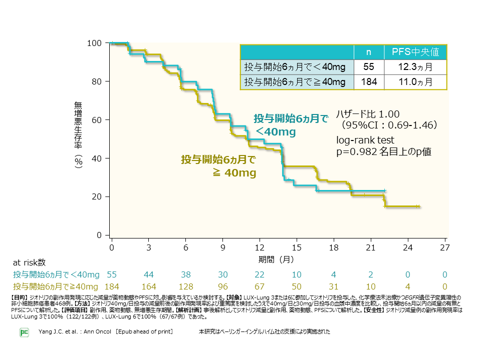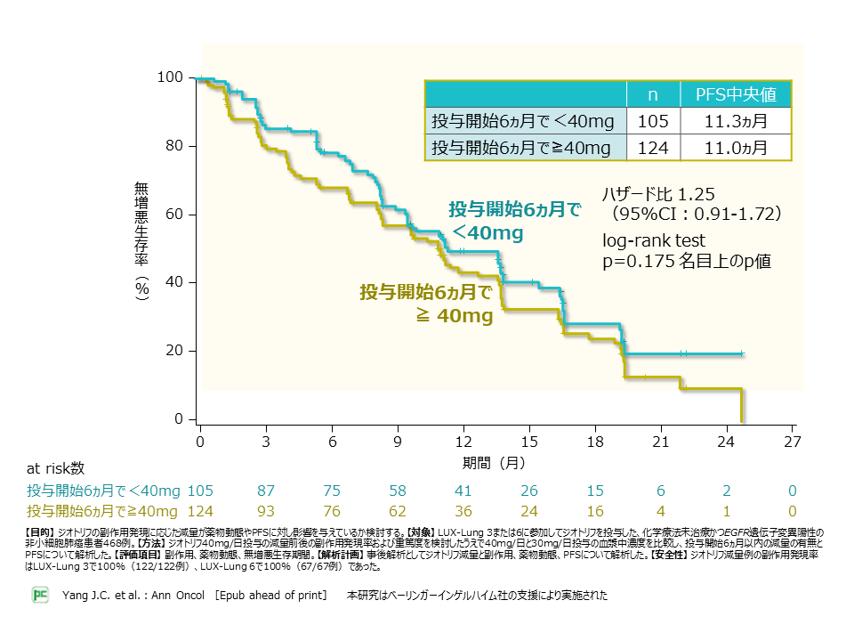 LUX-Lung6でも同様に減量した患者さんと減量していない患者さんでPFSの差は認められていません(PFS中央値12.3ヵ月、11.0ヵ月、ハザード比1.00、95%CI:0.69-1.46)。