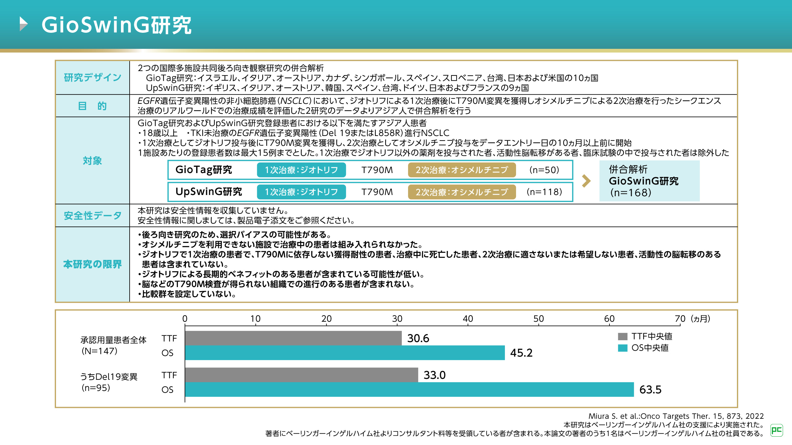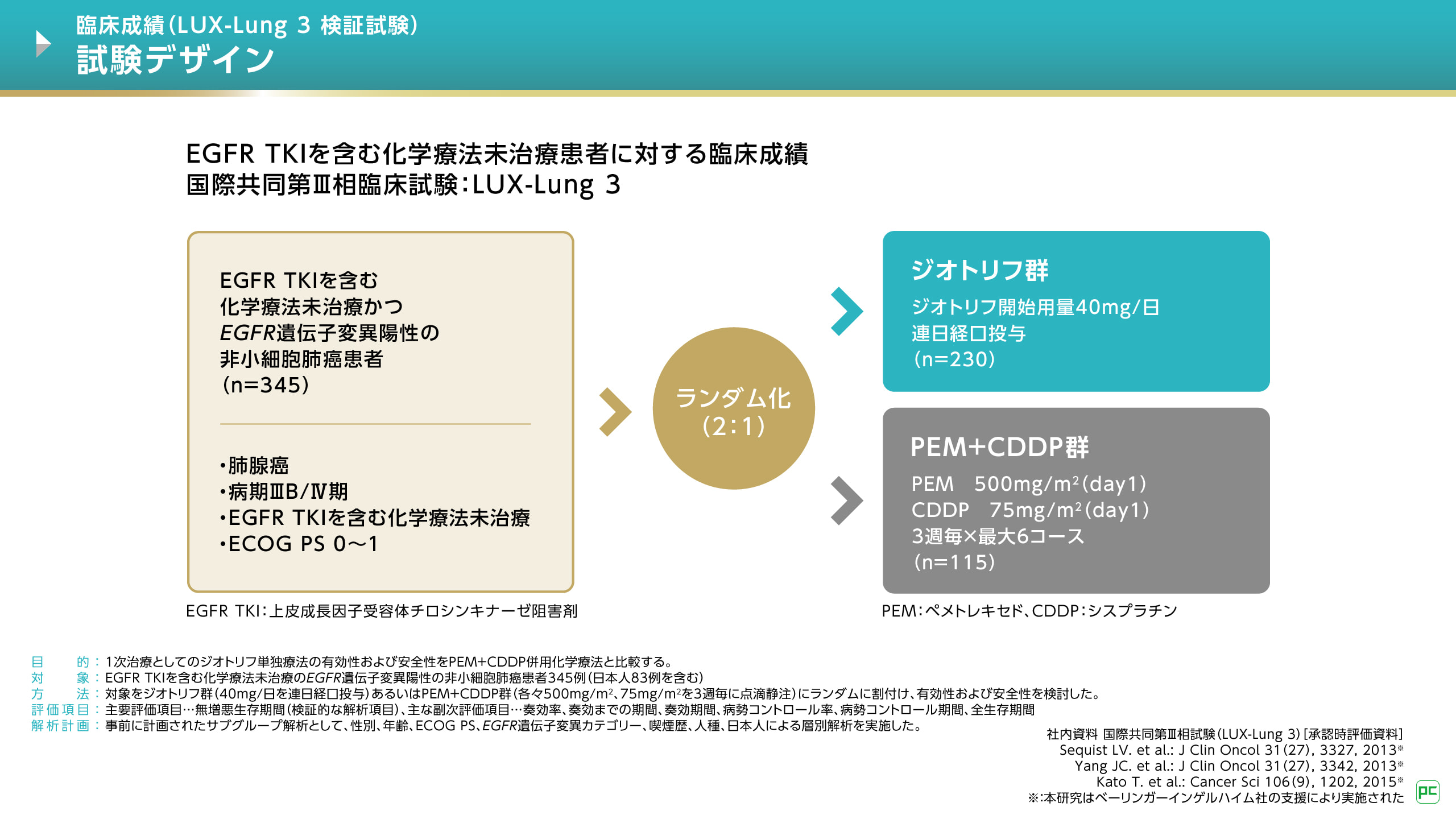 本試験は、Uncommon mutationを含むEGFR遺伝子変異陽性非小細胞肺癌(NSCLC)を対象に、1次治療におけるジオトリフ単独療法とPEM+CDDP併用化学療法の有効性と安全性を検討した国際共同第Ⅲ相臨床試験です。