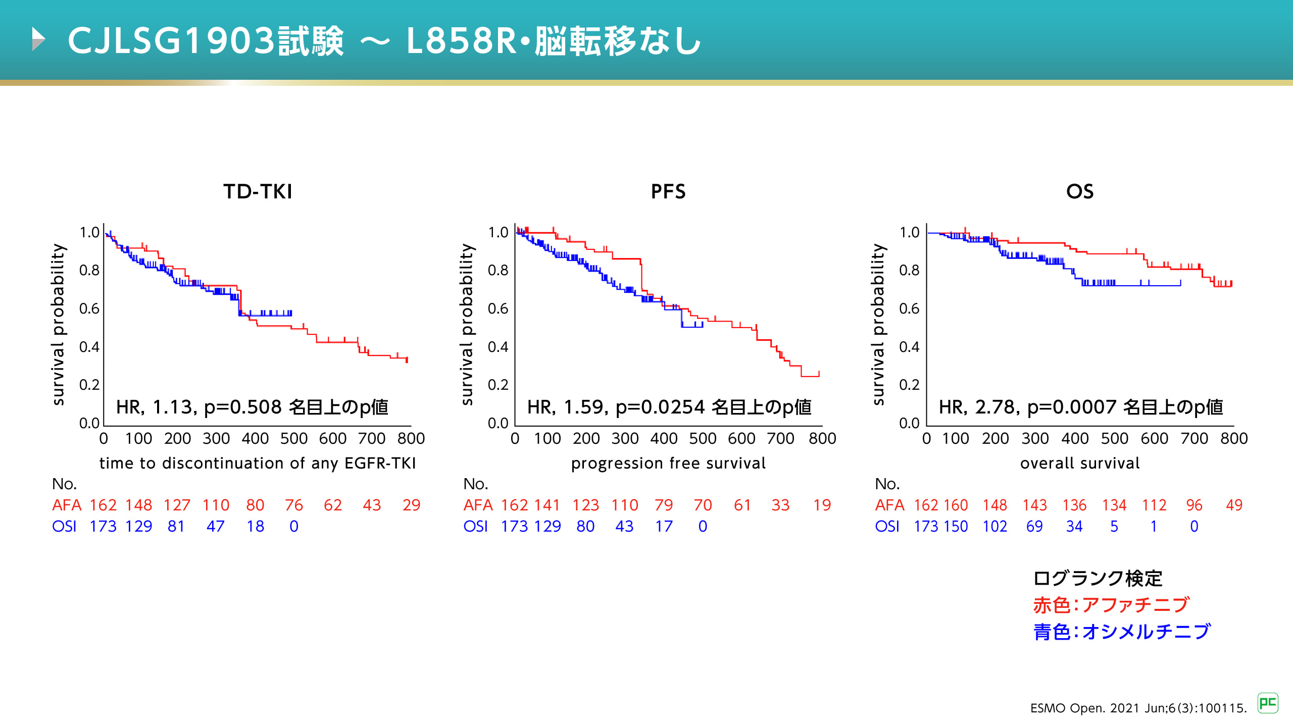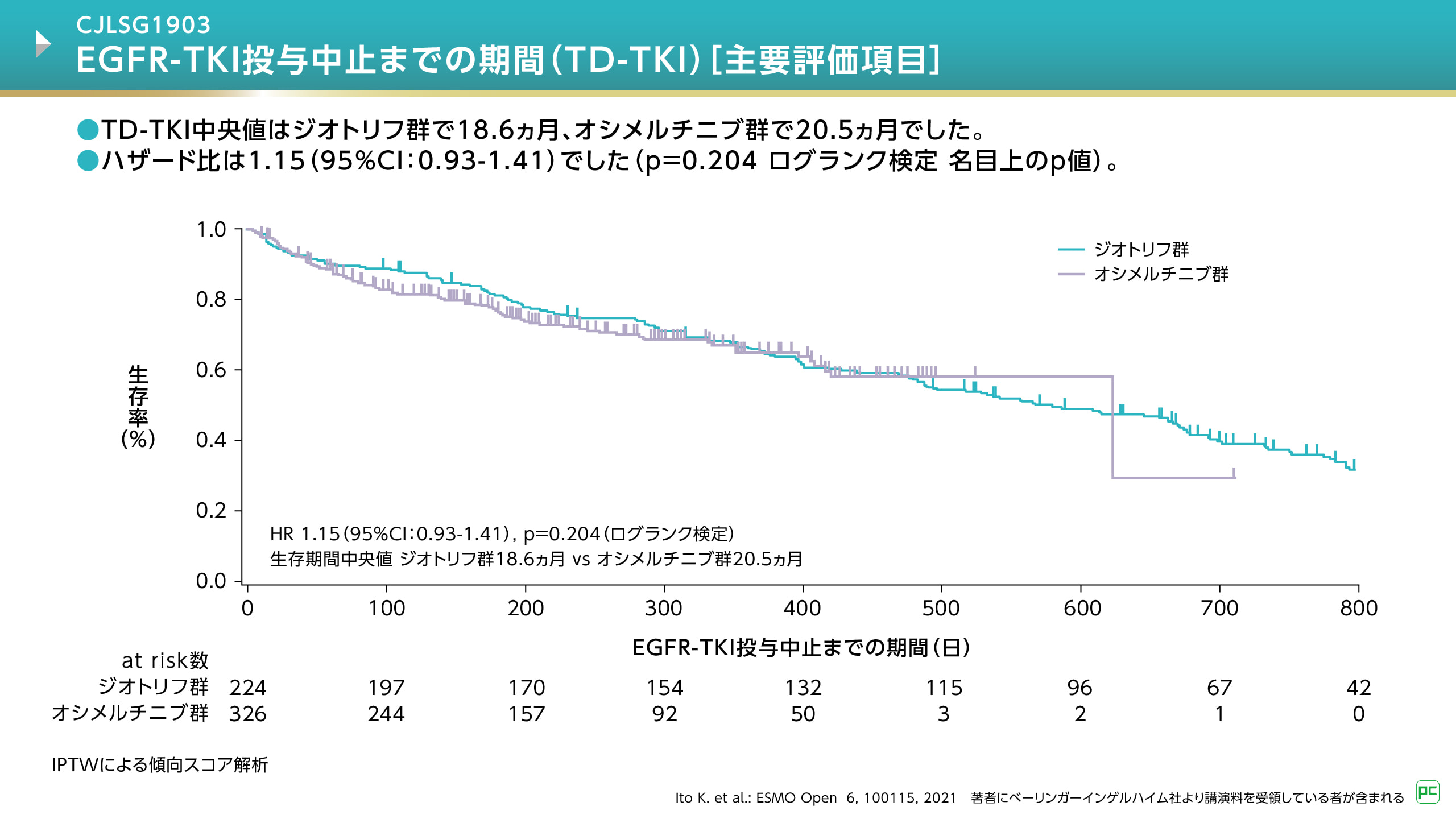 主要評価項目であるEGFR-TKI投与中止までの期間(TD-TKI)はジオトリフ群で18.6ヵ月、オシメルチニブ群で20.5ヵ月、ハザード比は1.15(95%CI:0.93-1.41)でした(p=0.204、ログランク検定)(図2)。OS中央値はそれぞれ36.2ヵ月および25.1ヵ月、PFS中央値はそれぞれ16.5ヵ月および20.5ヵ月であり、いずれも有意差はありませんでした。