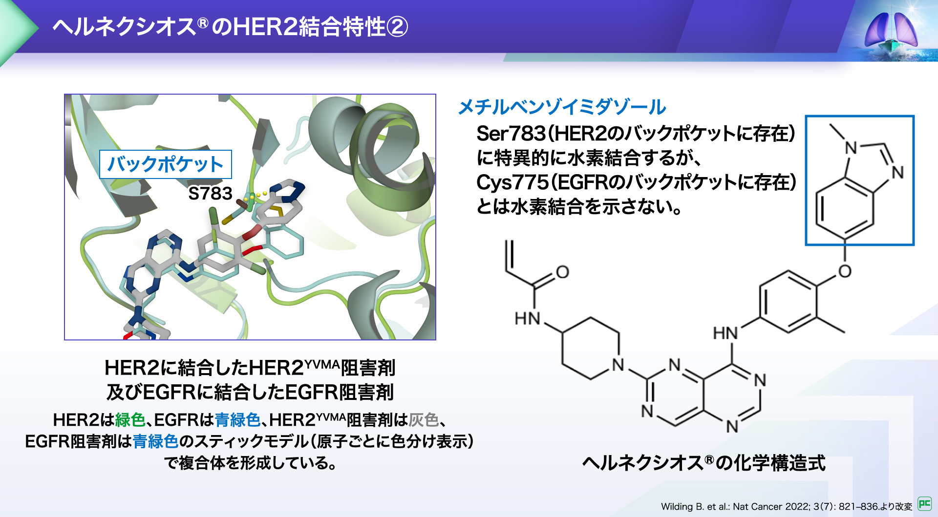 また、HER2のバックポケットにはSer783、EGFRにはCys775という結合部位が存在しますが、ヘルネクシオス®の化学構造に含まれるメチルベンゾイミダゾールは、Ser783に特異的に⽔素結合し、Cys775とは結合しないという特性を有しています。