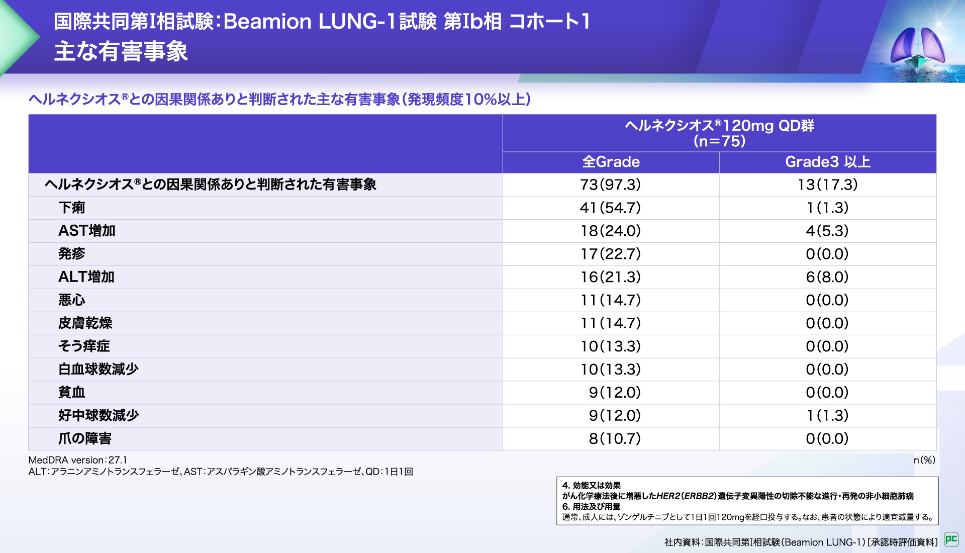 主な有害事象は下痢(54.7%)、AST増加(24.0%)、発疹(22.7%)、ALT増加(21.3%)などでした。