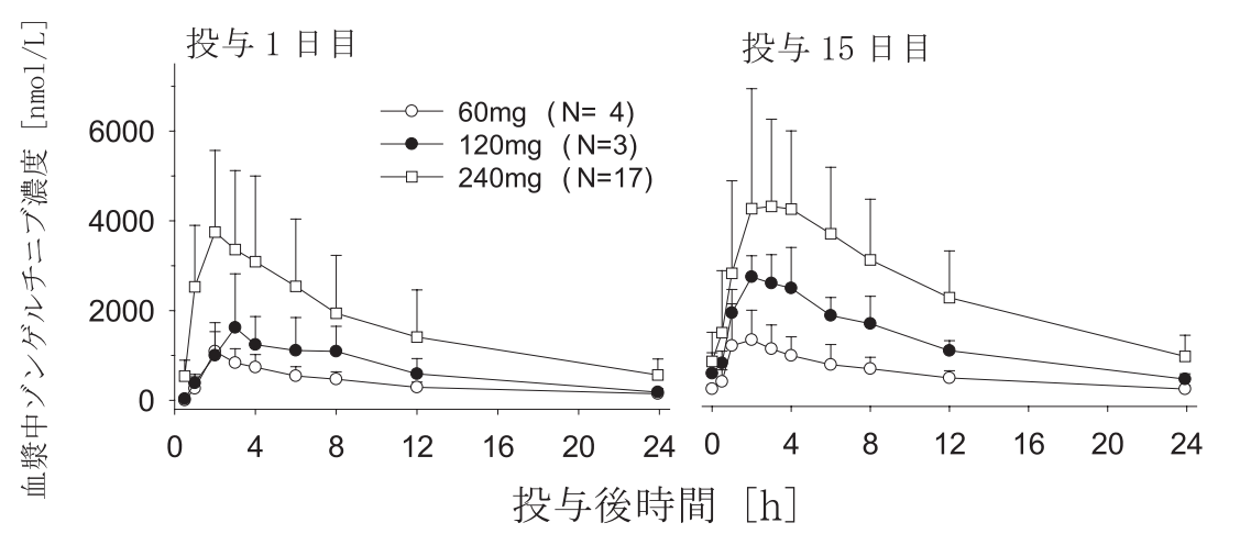 HER2(ERBB2)遺伝子異常を有する進行固形癌患者24例(日本人患者6例含む)に本剤60、120、又は240mgを空腹時に1日1回15日間反復経口投与注1)したときのゾンゲルチニブの血漿中濃度の時間推移及び薬物動態パラメータは以下の図1及び表1のとおりであった1)。