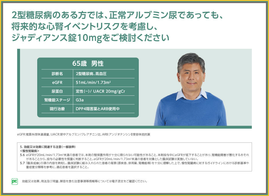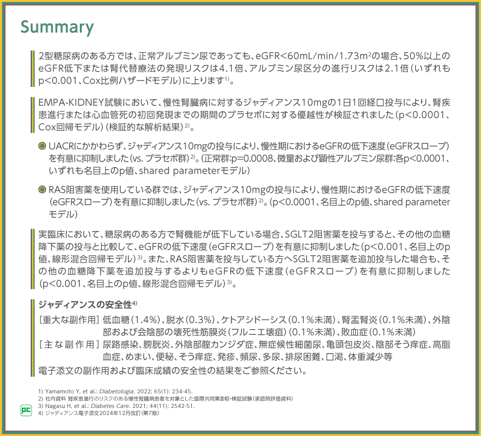 今回、2型糖尿病のある方のうち、正常アルブミン尿の方に対するマネジメントの考え方について、将来的なリスクとジャディアンスの有効性をご紹介しました。