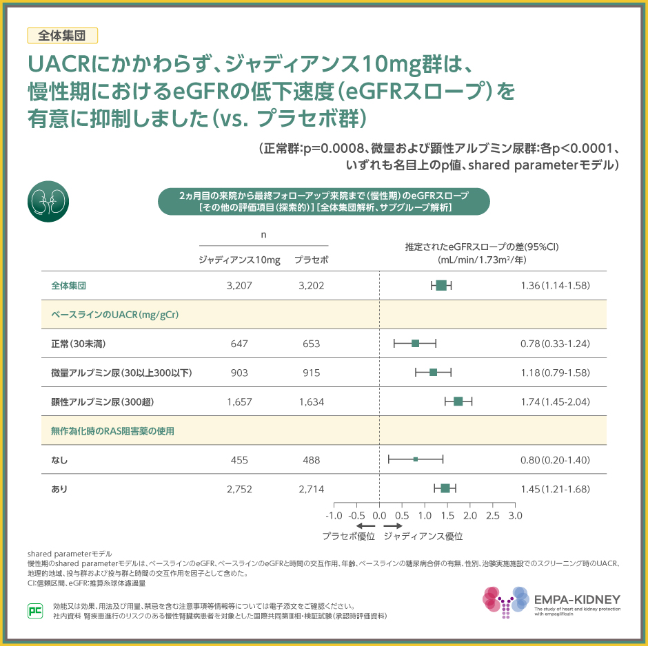2ヵ月目の来院から最終フォローアップ来院まで(慢性期)において、全体集団のジャディアンス10mg群では、UACRにかかわらず、eGFRスロープを有意に抑制しました(正常群:p=0.0008、微量および顕性アルブミン尿群:各p<0.0001、いずれもvs. プラセボ群、名目上のp値、shared parameterモデル)。