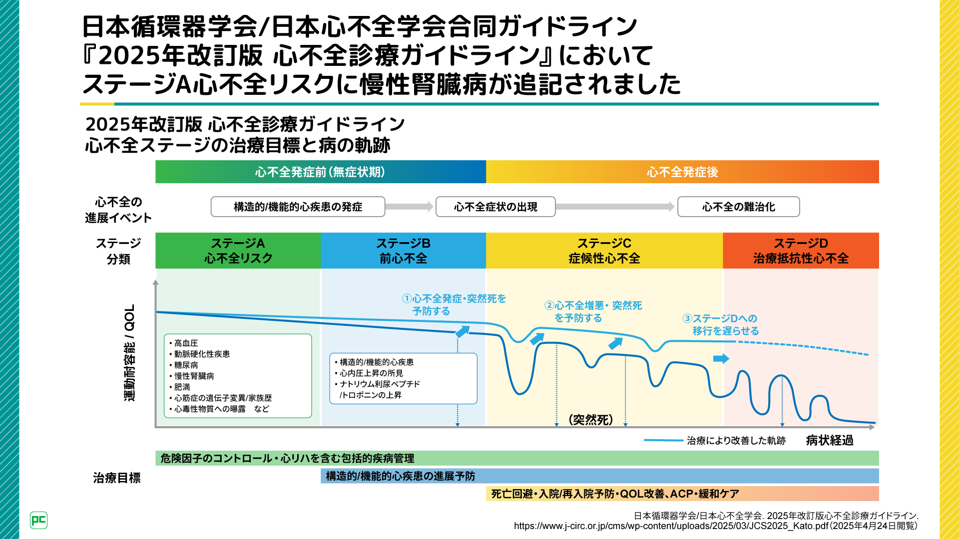 『2025年改訂版 心不全診療ガイドライン』でステージAにCKDが加わったことからも、腎機能低下は抑制した方がいいと頭ではわかっているんだ。ただ、原疾患の管理もしなきゃいけないうえに、eGFRもまだ極端に悪いわけではないから、CKDに対してどこまで積極的に介入すべきか、つい迷ってしまうんだ。