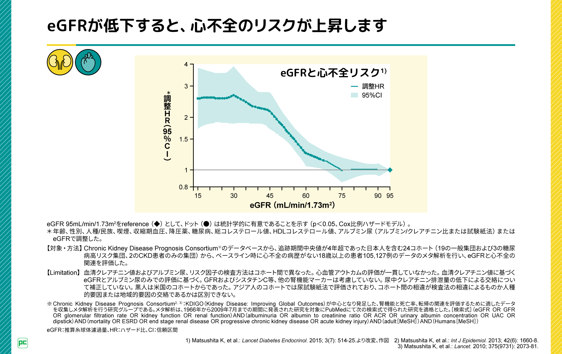 心不全の病歴がない患者さん105,127例のデータのメタ解析によりeGFRと心不全の関連を検討した研究では、eGFRが75mL/min/1.73m2に低下した段階で心不全リスクが上昇し始め、45mL/min/1.73m2まで低下すると2を超えたという報告もあるんだ。