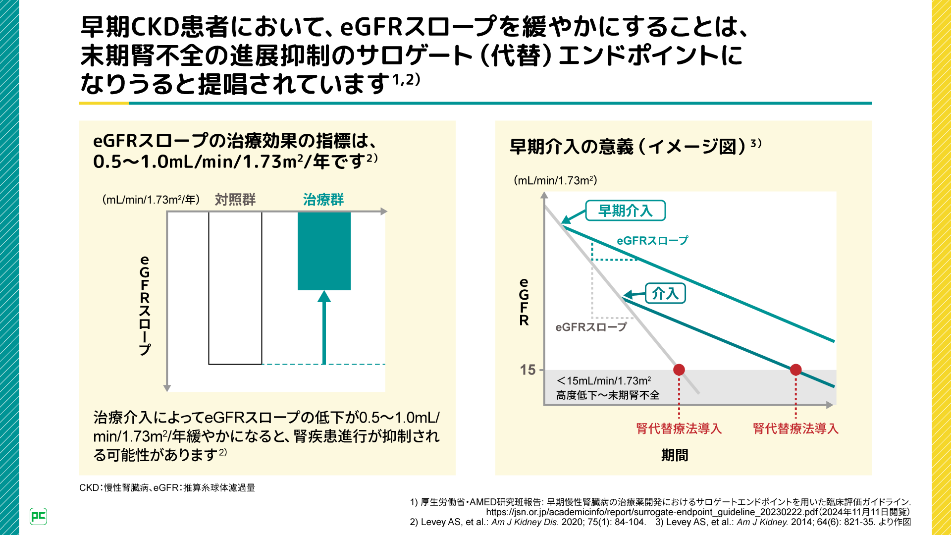 最近では、このeGFRスロープの低下を緩やかにすることが、末期腎不全の進展抑制のサロゲートエンドポイントになりうると提唱されているんだ。
