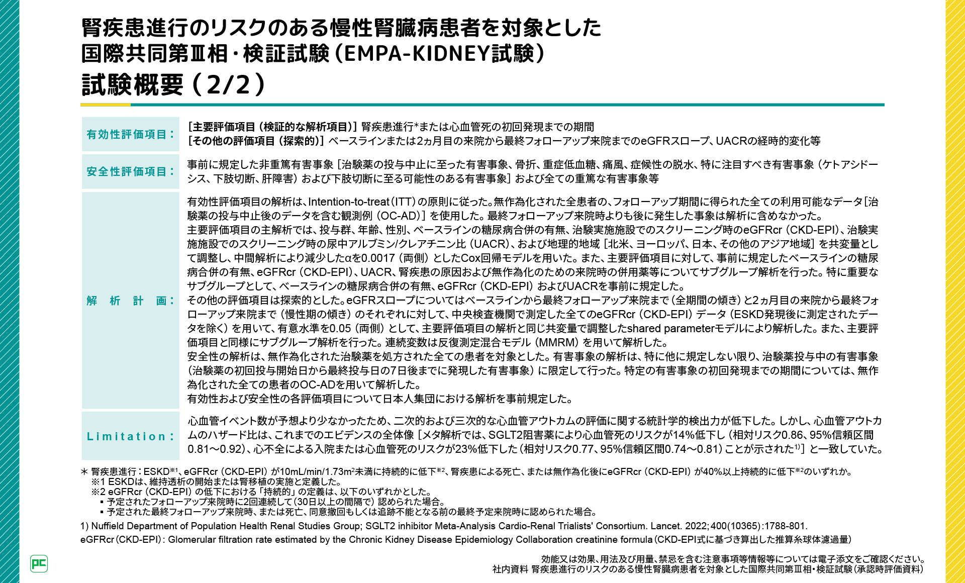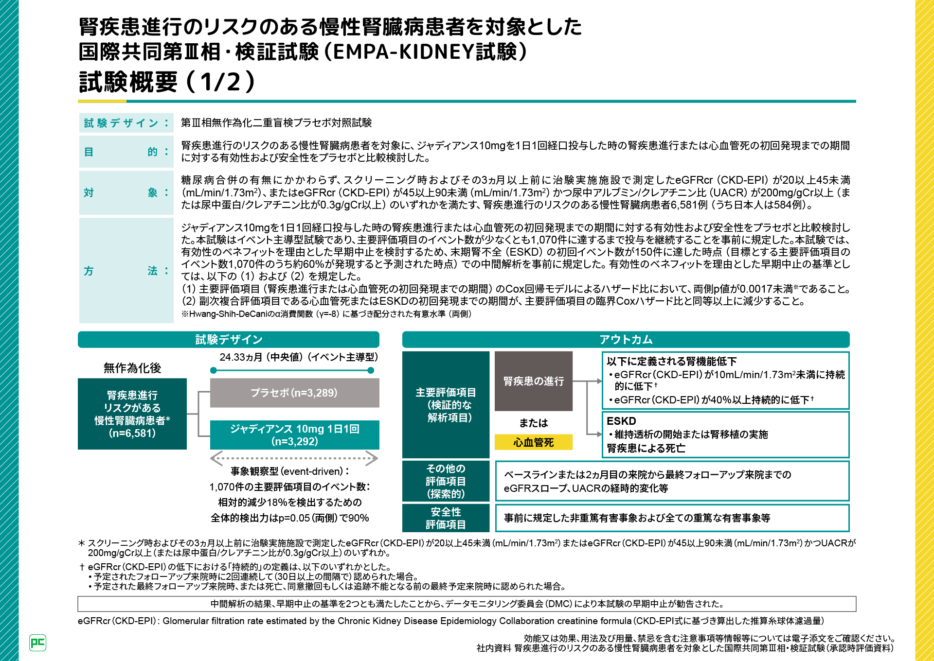 ここからは、CKD※の治療選択肢のひとつであるSGLT2阻害薬ジャディアンスの有効性および安全性を検討した国際共同第Ⅲ相試験 EMPA-KIDNEY試験についてご紹介します。
