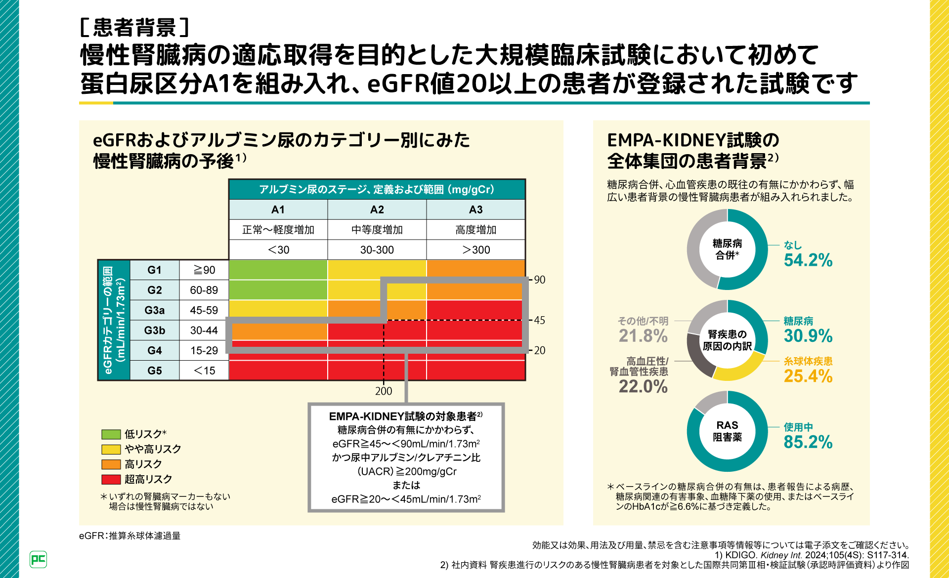 また、本試験には糖尿病合併、心血管疾患の既往、併用薬の有無にかかわらず、幅広い患者背景のCKD患者が組み入れられました。