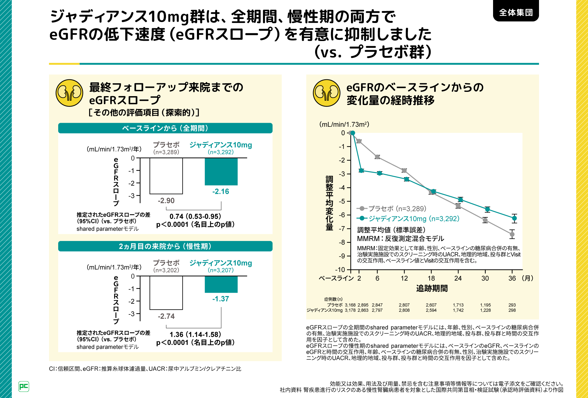 その結果、ベースラインから最終フォローアップ来院まで(全期間)のeGFRスロープは、プラセボ群-2.90に対してジャディアンス10mg群-2.16であり、事前規定された2ヵ月目の来院から最終フォローアップ来院まで(慢性期)のeGFRスロープは、プラセボ群-2.74に対してジャディアンス10mg群-1.37でした。