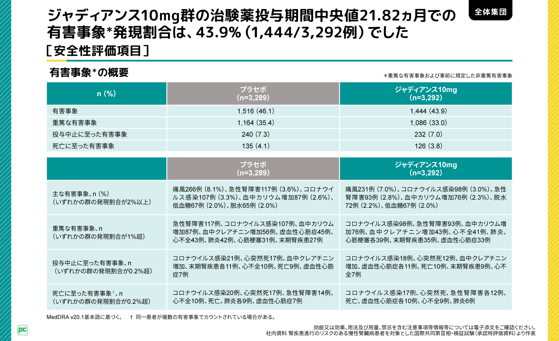 重篤な有害事象は、ジャディアンス10mg群でコロナウイルス感染98例、急性腎障害93例、血中カリウム増加76例等、プラセボ群で急性腎障害117例、コロナウイルス感染107例、血中カリウム増加87例等でした。