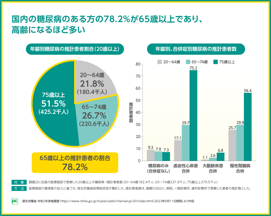 超高齢社会である日本では、成人の糖尿病のある方のうち、78.2%が65歳以上であると推定されることが令和5年の患者調査で報告されました。