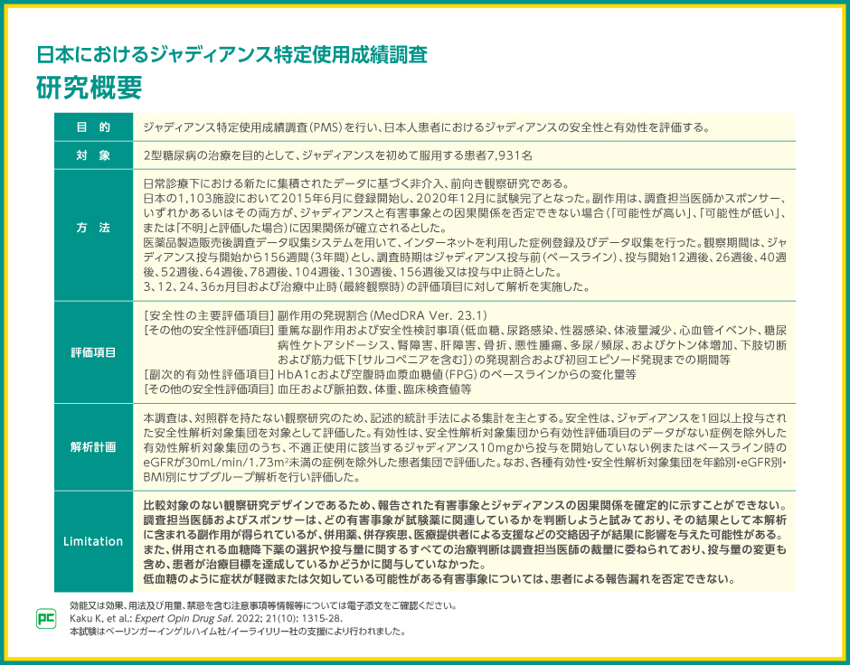 ジャディアンスでは、2型糖尿病の治療を目的として初めてジャディアンスを服用する方を対象に、特定使用成績調査が実施されました。