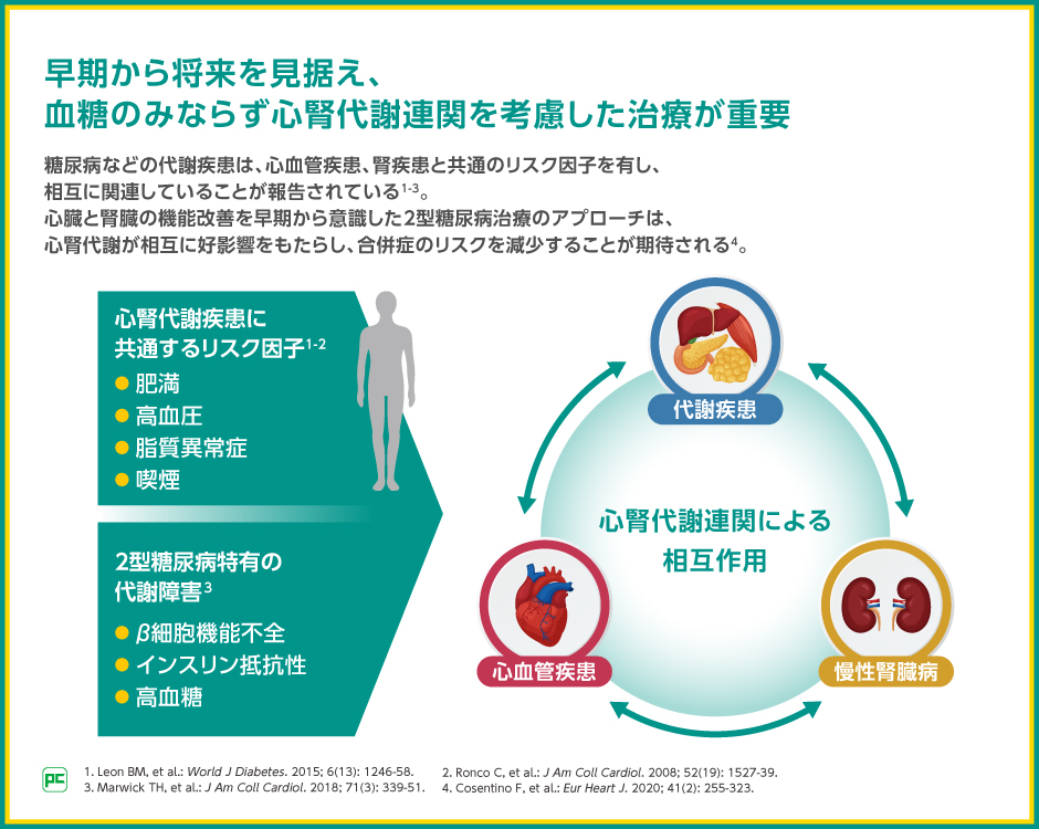 糖尿病とそれに伴う心腎合併症は肥満や高血圧など共通のリスク因子を有しており、相互に関連していることが知られています。