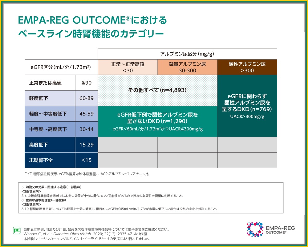なおこの試験には、eGFR≧60(正常または高値、軽度低下)で顕性アルブミン尿を呈さない患者、eGFR低下例で顕性アルブミン尿を呈さないDKD、eGFRに関わらず顕性アルブミン尿を呈するDKDといった幅広い腎機能の患者が含まれていました。